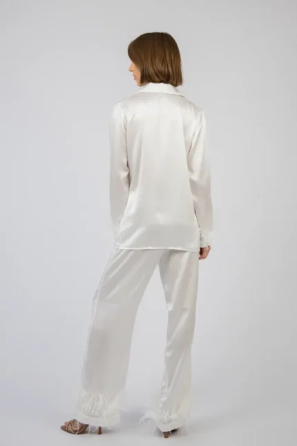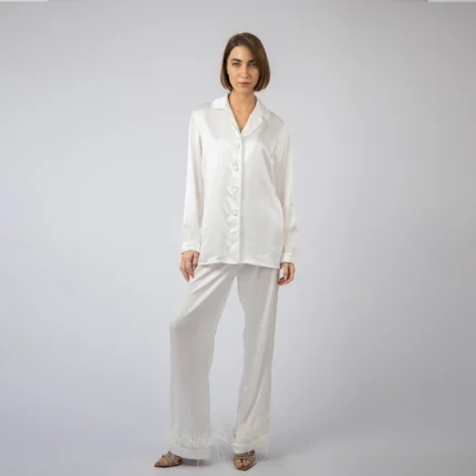 100% Svilena Bela Pidžama sa Perjem
