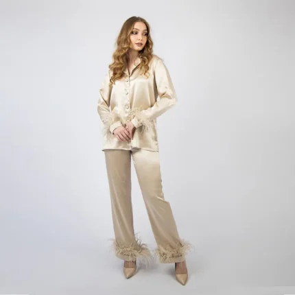 100% Svilena Bež Pidžama sa Perjem